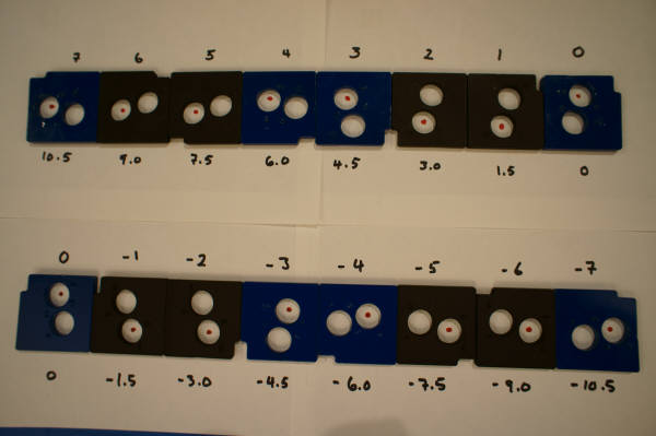 ![]() y putting the shim in the various orientations shown below, and making sure the bolt is in the hole with the red dot in it, you can estimate the desired offset from center. |